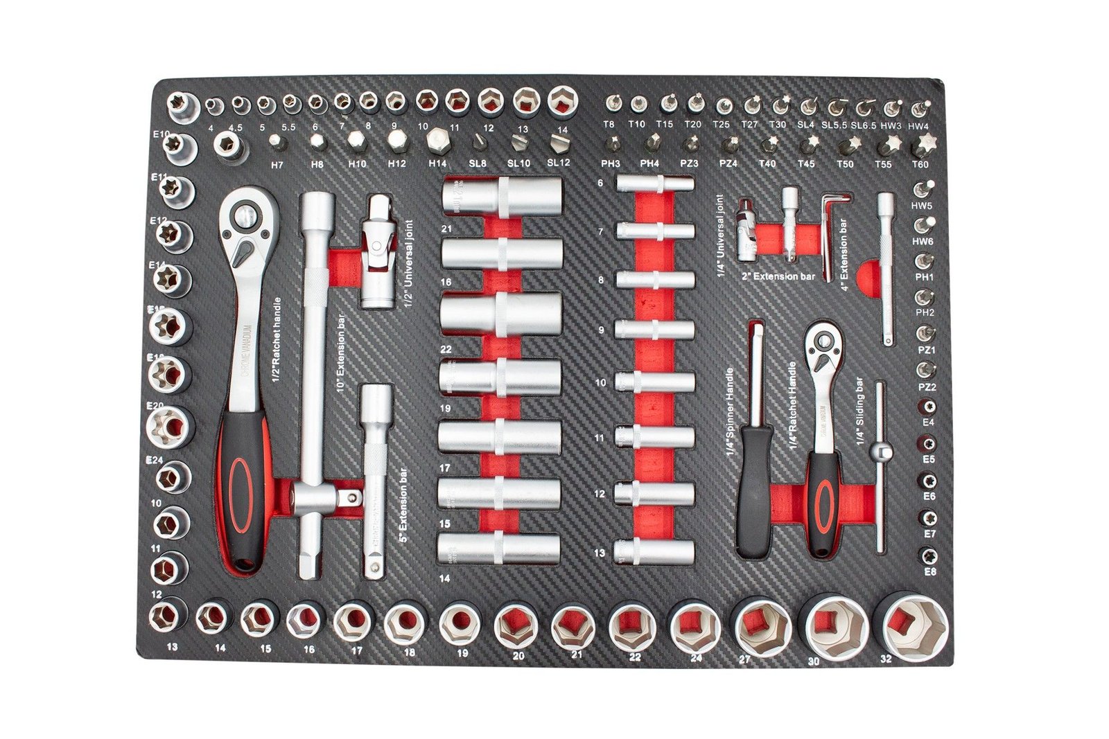 • (9 vnt.) 1/2” ilgos antgalių galvutės: T40–T70, M10–M14 (ilgis 139 mm)