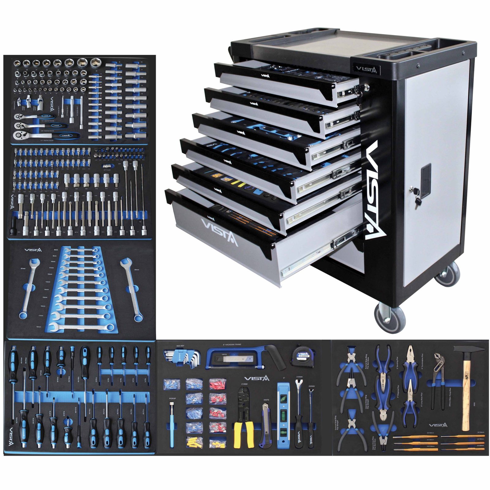 1. Įrankių vežimėlis su 7 stalčiais su nerūdijančio plieno viršumi.