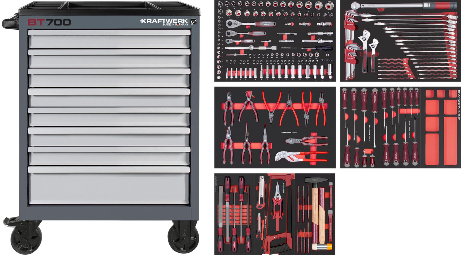 Titulinis | Produktai | Įrankiai, įranga ir medžiagos autoservisams | Autoservisų įranga | Įrankių vežimėliai | Įrankių vežimėliai su įrankiais | Įrankių vežimėlis su įrankiais KRAFTWER BT700 8 stalčiukų, 242 įrankis