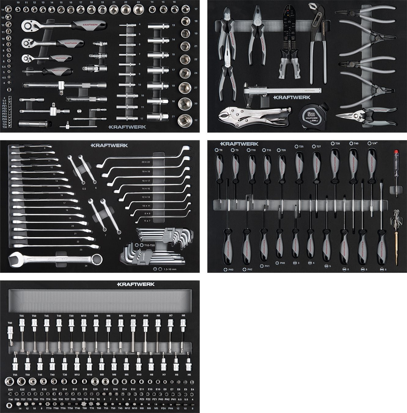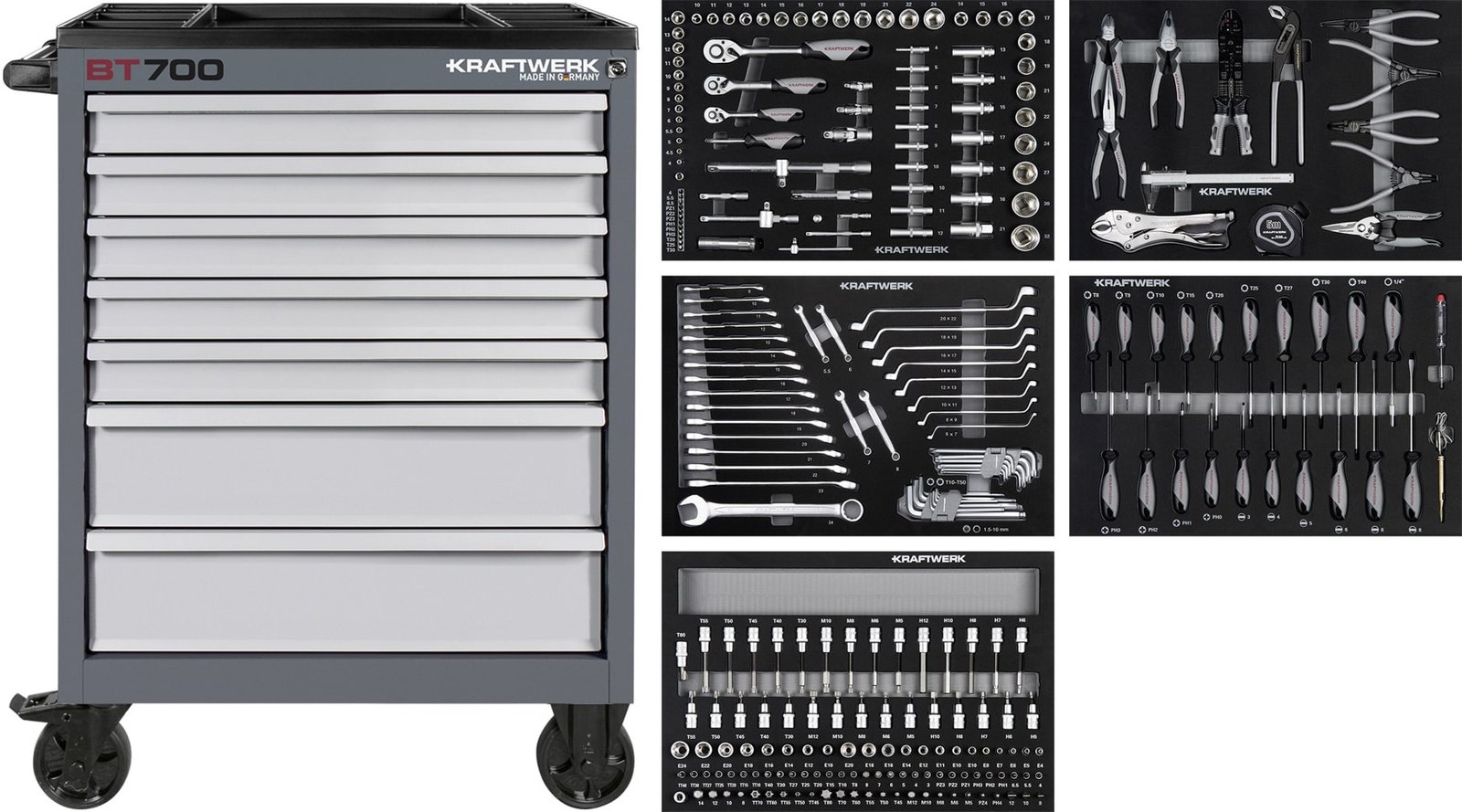 Titulinis | Produktai | Įrankiai, įranga ir medžiagos autoservisams | Autoservisų įranga | Įrankių vežimėliai | Įrankių vežimėliai su įrankiais | Įrankių vežimėlis su įrankiais KRAFTWERK BT700 7 stalčiukų, 274 įrankis