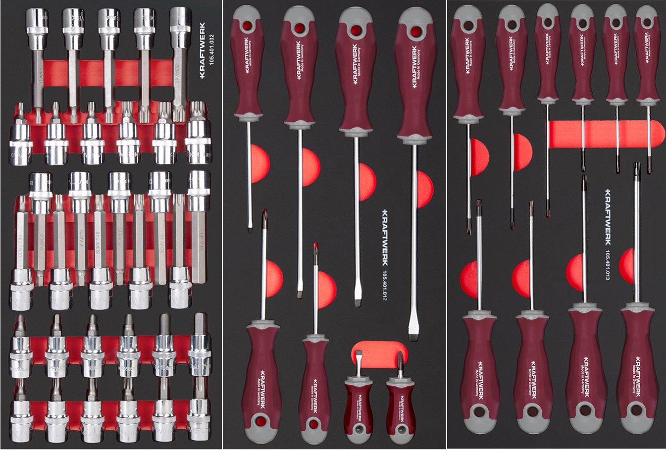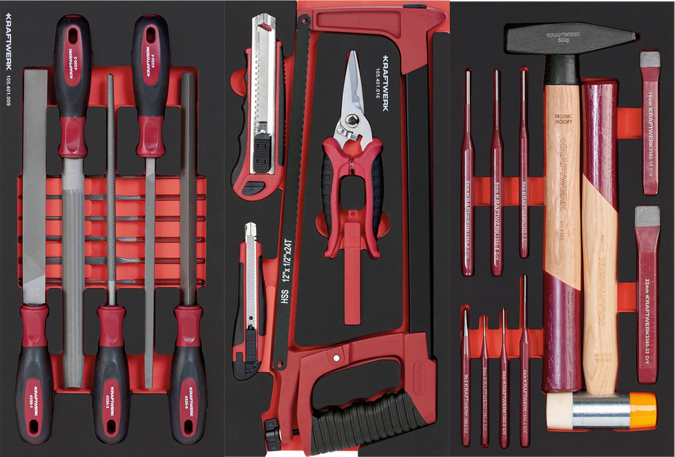 Įrankiai sudėti į 15 minkštus didelio tankio putplasčio (EVA) įdėklus
