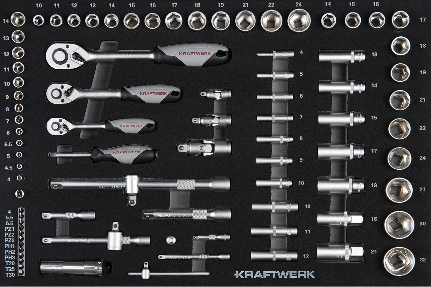- 1/4″ galvučių rinkinys: 4 – 14 mm