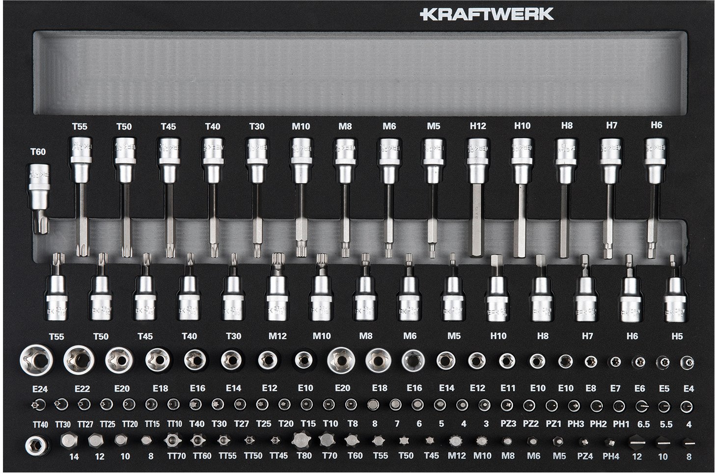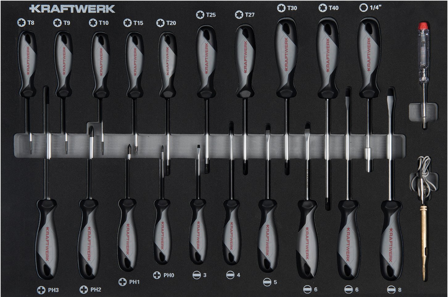 - Atsuktuvų rinkinys: PH0 – PH3, plokšti 3 – 8 mm, TX T8 – T40