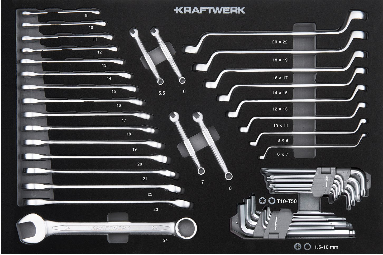 - Kombinuotų raktų rinkinys: 5,5 – 32 mm