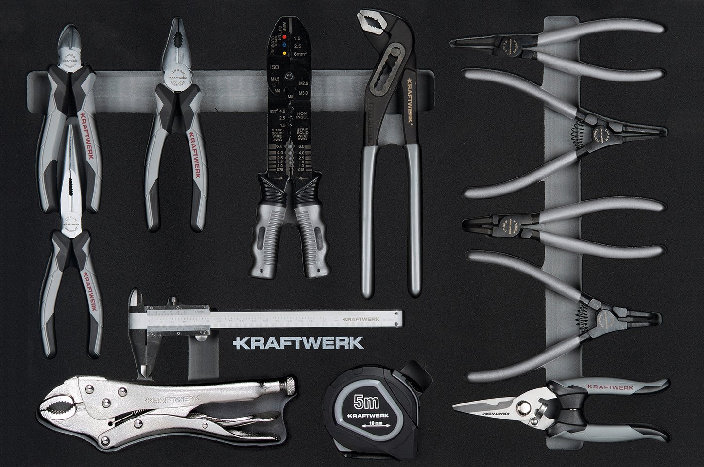 Įrankiai sudėti į 9 minkštus didelio tankio putplasčio (EVA) įdėklus