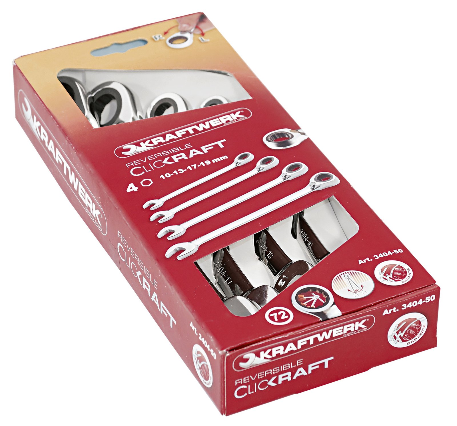 Titulinis | Produktai | Mechaniniai įrankiai | Kombinuoti raktai | Kombinuoti terkšliniai raktai | Kombinuotų raktų komplektas KRAFTWERK, 10-19 mm, 4 įrankiai