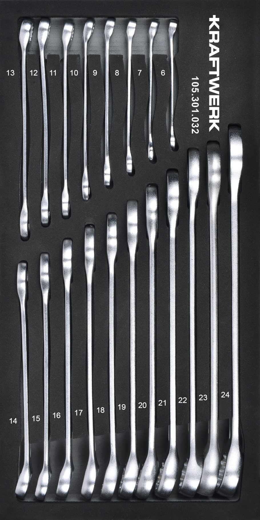 Titulinis | Produktai | Mechaniniai įrankiai | Įrankių komplektai | Įrankių komplektai į vežimėlį | Kombinuotų veržliarakčių komplektas KRAFTWERK BASIC LINE EVA 20 × 40 cm, 19 įrankiai