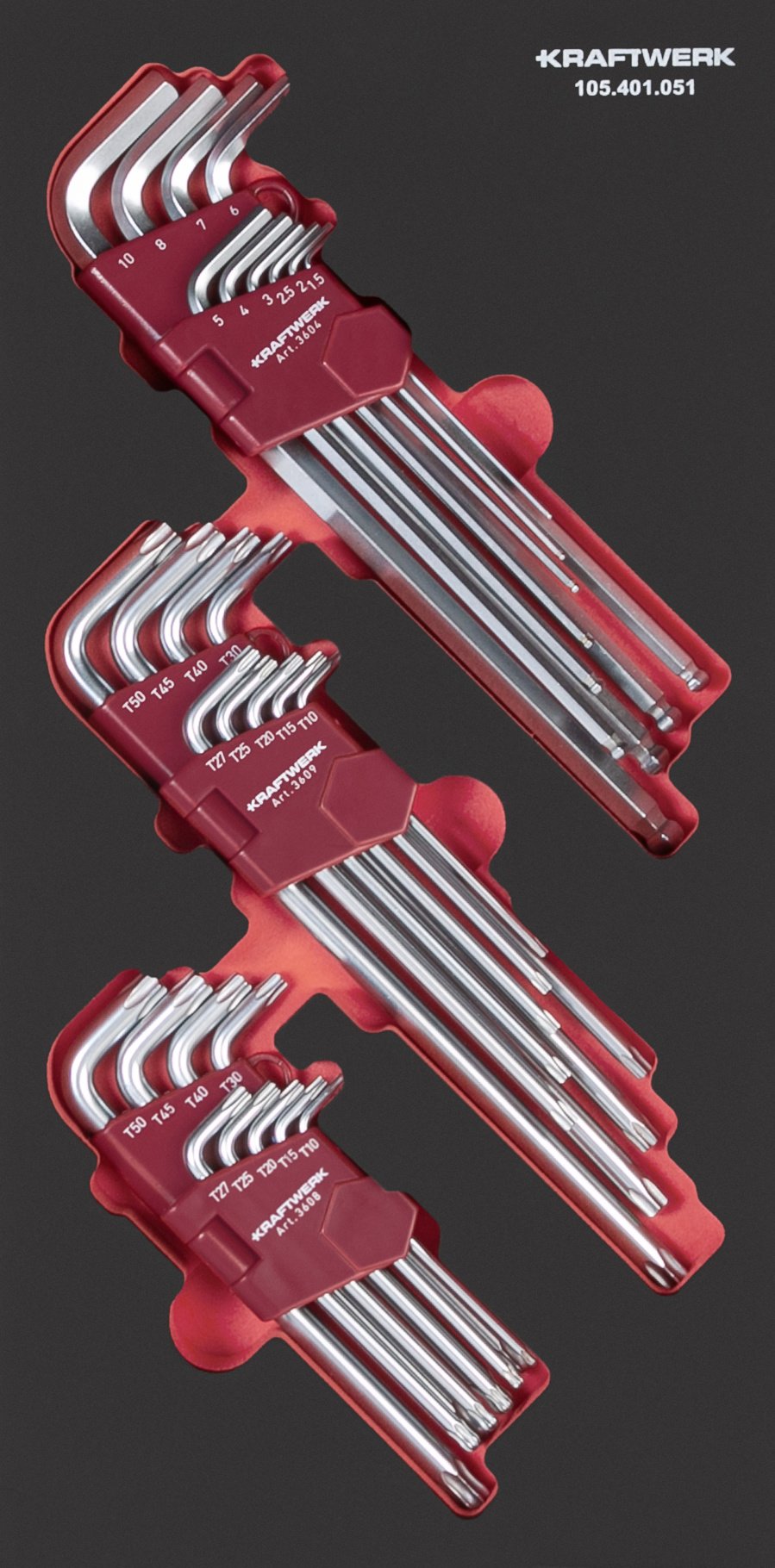 Titulinis | Produktai | Mechaniniai įrankiai | Įrankių komplektai | Įrankių komplektai į vežimėlį | L formos veržliarakčiaų komplektas KRAFTWERK PRO LINE EVA 20 × 40 cm, 28 įrankiai