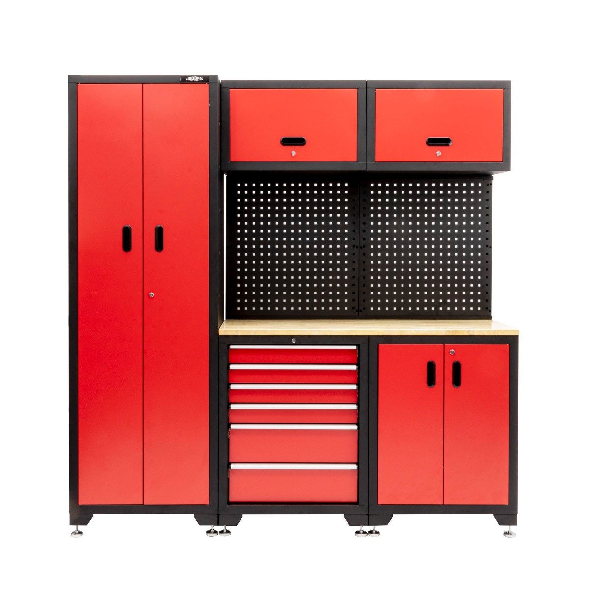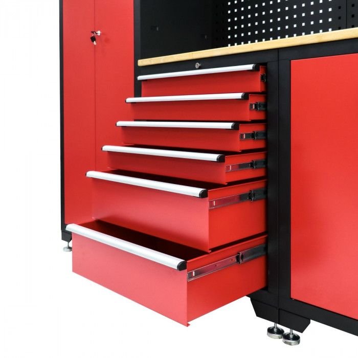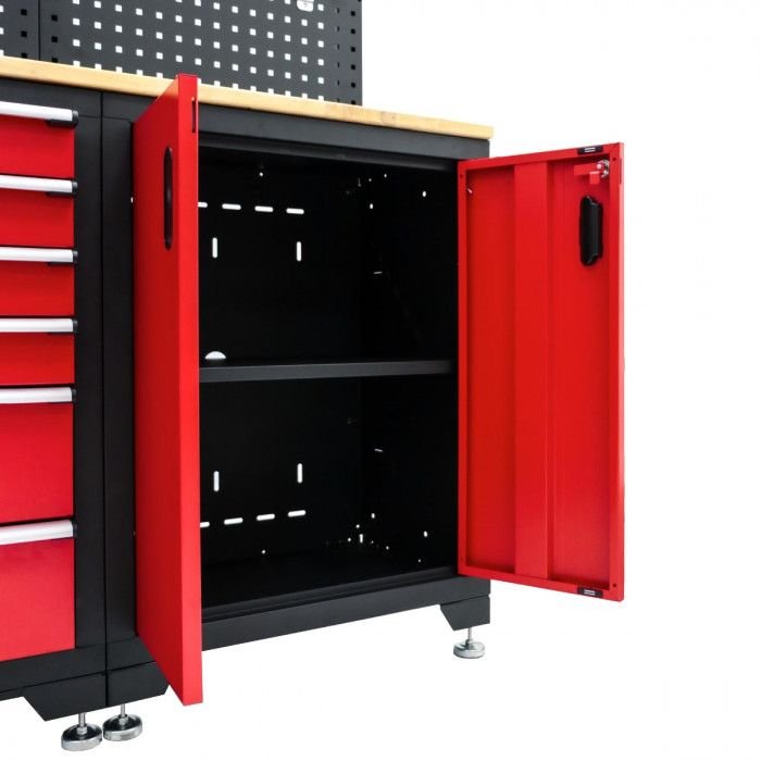 Šiuo moduline dirbtuvių komplektu turėsite pilną dirbtuvių baldą. Komplekto sudėtyje yra didelė šoninė spinta su atidaromomis durimis, apatinė spinta su šešiomis stalčiukais, pavyzdžiui, įrankiams, dvi viršutinės spintos, maža spinta ir galinė siena, kurioje papildomai galima kabinti įrankius ant kabliukų. Modulinė spinta turi matmenis 198,3 x 51 x 192,5 cm. Siekiant apsaugoti stalą, beržo viršus yra padengtas linų aliejumi ir turi matmenis 132 x 44 cm.