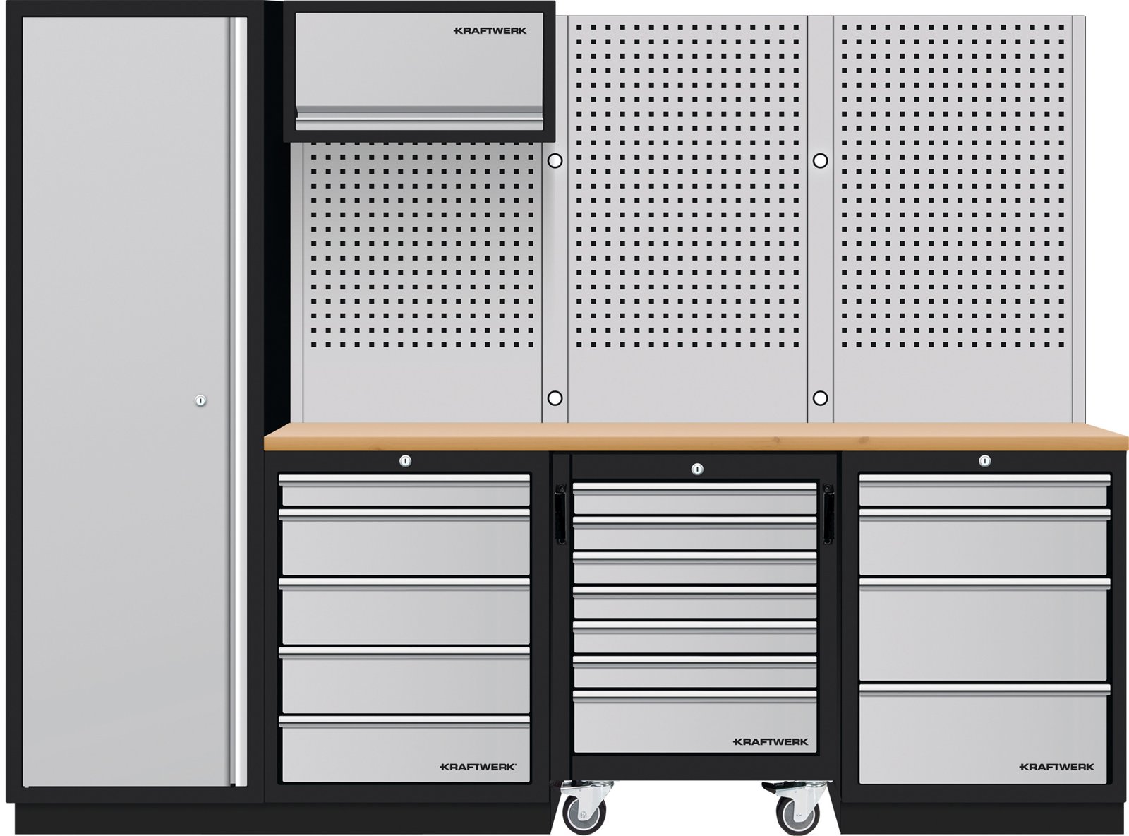 - Su KRAFTWERK MOBILIO 4 dalių rinkiniu gaunate universalią sistemą, leidžiančią sukurti idealiai tvarkingą darbo aplinką. Šis rinkinys, sudarytas iš stalčių spintelių, mobilios dirbtuvių spintelės, aukštos spintos ir tvirtų perforuotų sienelių, suteikia viską, ko reikia efektyviam įrankių laikymui ir lengvai prieigai. Dėl aukštos kokybės buko daugiasluoksnio stalviršio ir laisvai statomos konstrukcijos, sistema lengvai prisitaiko prie individualių poreikių.