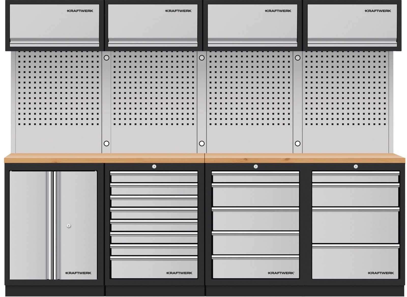 - Su KRAFTWERK MOBILIO 4 dalių rinkiniu gaunate universalią sistemą, leidžiančią sukurti idealiai tvarkingą darbo aplinką. Šis rinkinys, sudarytas iš stalčių spintelių, mobilios dirbtuvių spintelės, aukštos spintos ir tvirtų perforuotų sienelių, suteikia viską, ko reikia efektyviam įrankių laikymui ir lengvai prieigai. Dėl aukštos kokybės buko daugiasluoksnio stalviršio ir laisvai statomos konstrukcijos, sistema lengvai prisitaiko prie individualių poreikių.