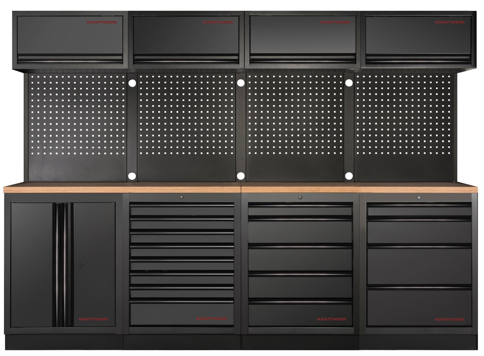 • Su KRAFTWERK MOBILIO BLACK 4 dalių rinkiniu gaunate universalią sistemą, leidžiančią sukurti idealiai tvarkingą darbo aplinką. Šis rinkinys, sudarytas iš stalčių spintelių, mobilios dirbtuvių spintelės, aukštos spintos ir tvirtų perforuotų sienelių, suteikia viską, ko reikia efektyviam įrankių laikymui ir lengvai prieigai. Dėl aukštos kokybės buko daugiasluoksnio stalviršio ir laisvai statomos konstrukcijos, sistema lengvai prisitaiko prie individualių poreikių.