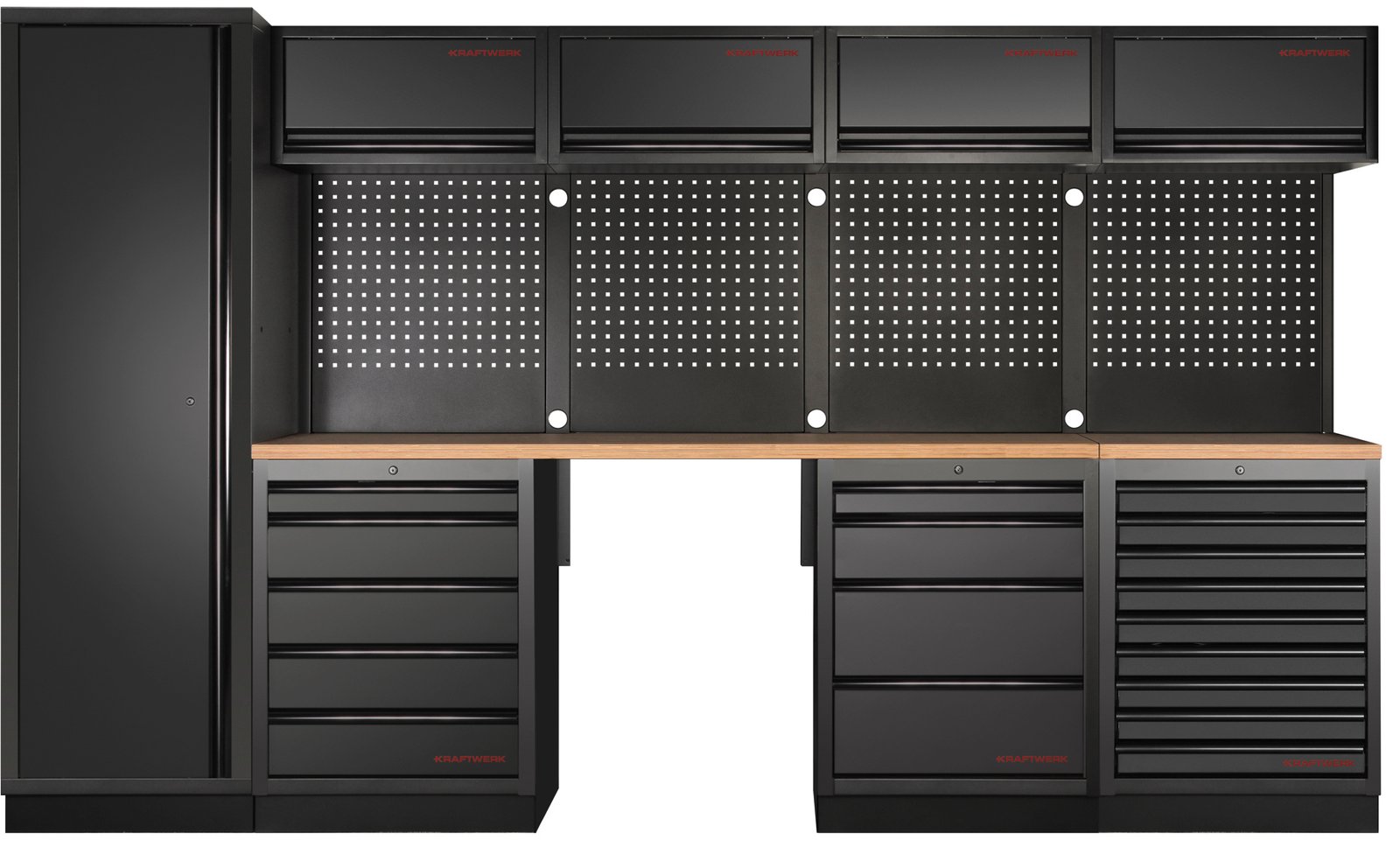 KRAFTWERK MOBILIO BLACK siūlo apgalvotą aukštos spintos, stalčių spintelių ir pakabinamų spintelių kombinaciją. Vienerių durų aukšta spinta su 4 lentynomis suteikia daug vietos didesniems įrankiams ar medžiagoms laikyti. Be to, trys stalčių spintelės su iš viso 18 įvairių dydžių stalčių leidžia tvarkingai saugoti viską – nuo mažų atsuktuvų iki grąžtų. Visi stalčiai yra guoliniai, todėl lengvai ir sklandžiai atsidaro net ir stipriai apkrauti. - Lankstumas ir plėtimo galimybės