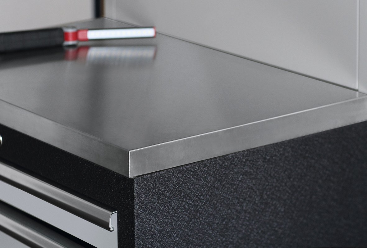 Nerūdijančiojo plieno stalviršis: Stalviršis, pagamintas iš aukštos kokybės nerūdijančiojo plieno, yra ne tik patvarus, bet ir lengvai prižiūrimas bei higieniškas – idealiai tinka naudoti bet kurioje dirbtuvėje. Jis suteikia didelį darbo paviršių įvairiems projektams ir yra pakankamai tvirtas, kad atlaikytų kasdienį naudojimą.